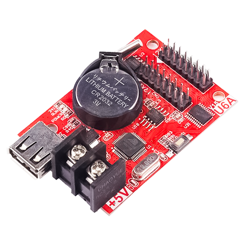 کارت کنترل نمایشگر LED، سیگنالهای دیجیتال را از رایانه یا منبع دیگر دریافت کرده و آنها را به زبان قابل درک برای نمایشگر LED ترجمه میکند. بسته به نوع نمایشگر (تکرنگ، فولکالر، ویدئویی)، انواع مختلفی از کارت کنترل وجود دارد.